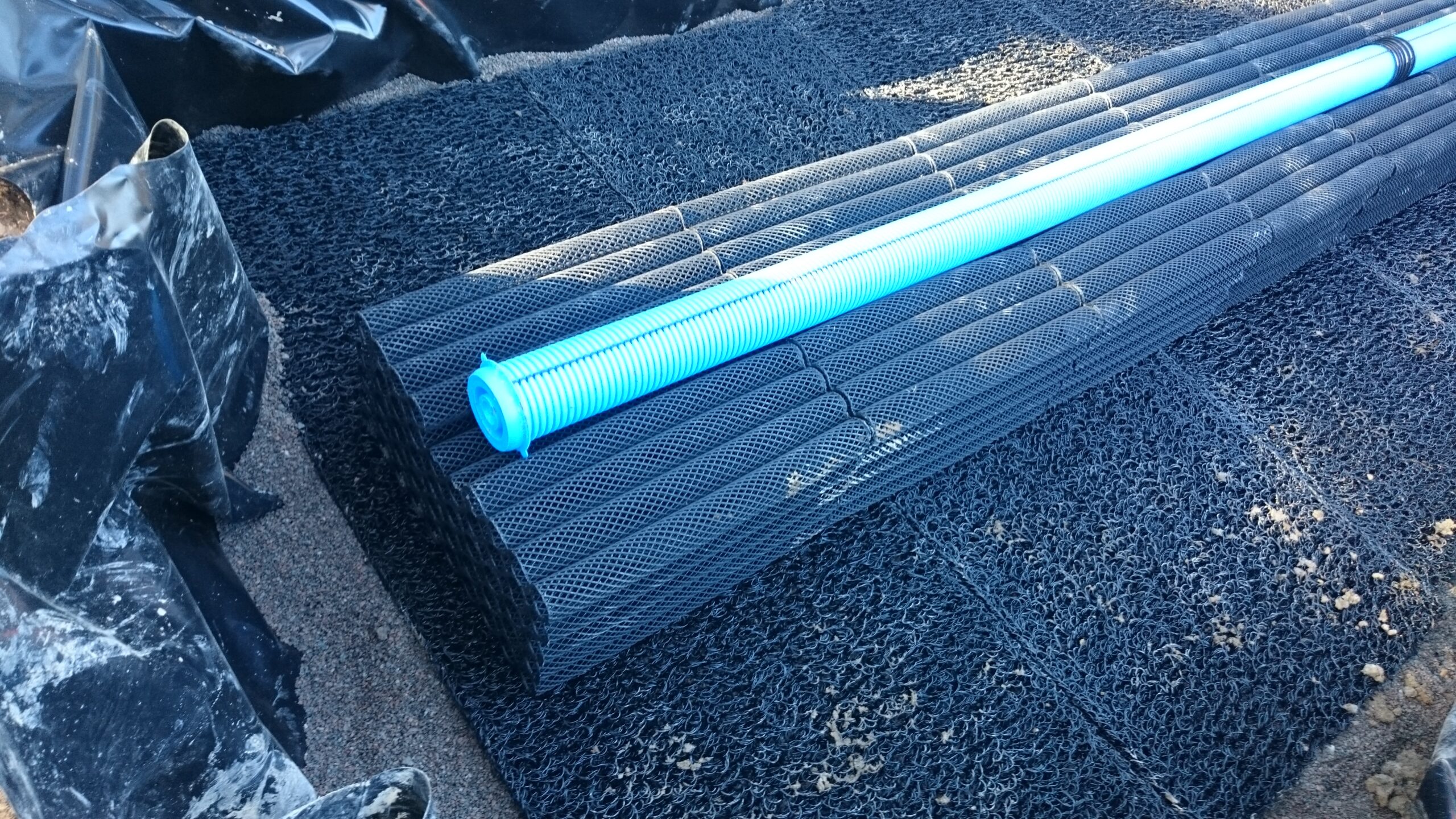 Längs med botten av grunden lägger vi en dräneringsslang som går ut i dagvattenledningen via självfall, eller pumpbrunn om dagvattenledningen ligger för högt.